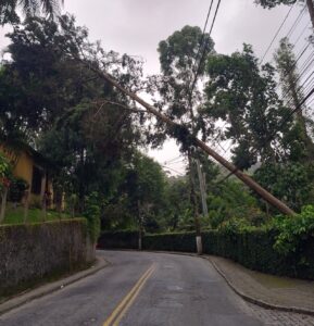 Desde a sexta-feira, uma grande árvore tombou sobre a rede elétrica, no início da estrada do Carangola.