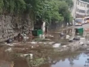 A via, crucial para a ligação de diversos bairros ao Centro, ficou completamente inundada, transformando-se em um rio de lama e detritos que impossibilitou a passagem de pedestres e motoristas. O "sinal de alerta" já estava aceso, mas a combinação letal entre o descarte irregular e a falha na zeladoria urbana cobrou o seu preço.